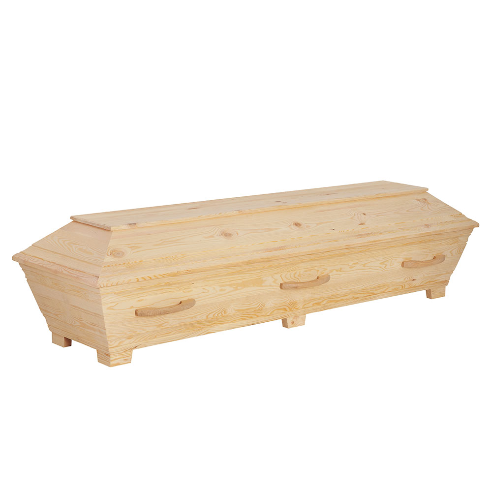 Sandholm är en traditionell furukista i en träkvalité med ett fåtal kvistar. Handtagen är i massivt bokträ och har fina profileringar på lock och botten. Den är klädd i botten och är bäddad med kudde, täcke och lakan i bomullstyg.